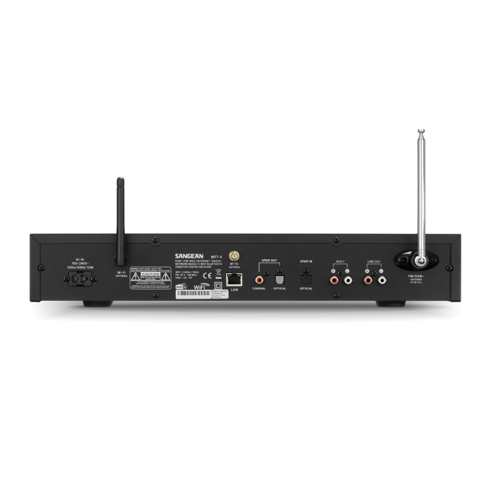 Das WFT-4 ist ein vielseitiger Internetradio-Empfänger, er empfängt Radiostationen über DAB+ und das Internet. Zusätzlich zu seiner traditionellen Bluetooth-Empfangsfunktion verfügt der WFT-4 auch über eine Bluetooth-Übertragung. So können Kopfhörer direkt mit dem WFT-4 verbunden werden.